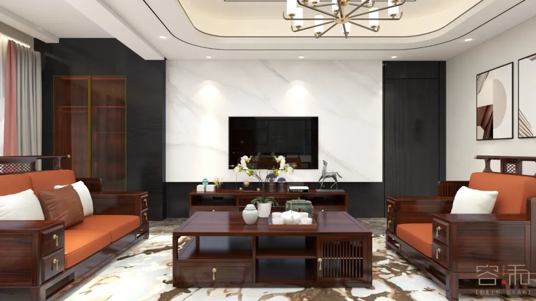 這套方案是以新中式為設計思路,充分展示中式文化與現代工藝的結合,客戶要求體現中國文化,但是不要一味的照搬傳統文化,在此基礎上,設計師充分理解了客戶的想法后,以黑檀木色為色調設計了這套方案。
