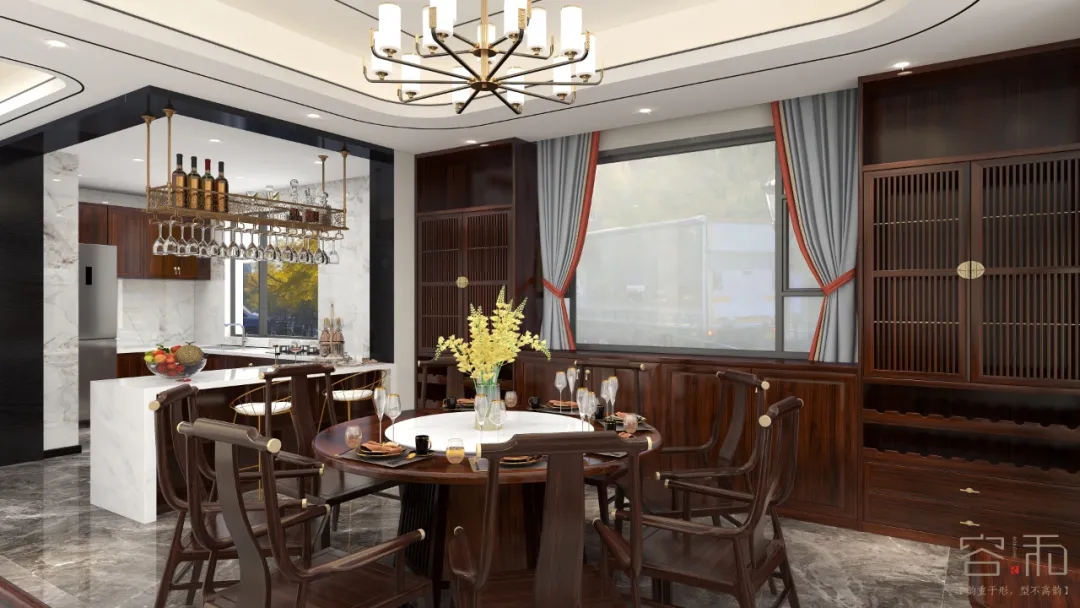 餐廳選用圓形餐桌,底座是六合造型,符合中國天圓地方的寓意。圓又有團圓之意,一家人在一起團圓,其樂融融。靠窗位置,設計師設計了滿墻柜,既有展示功能又有儲藏功能,還不遮擋窗戶,保證了餐廳充足的光線。