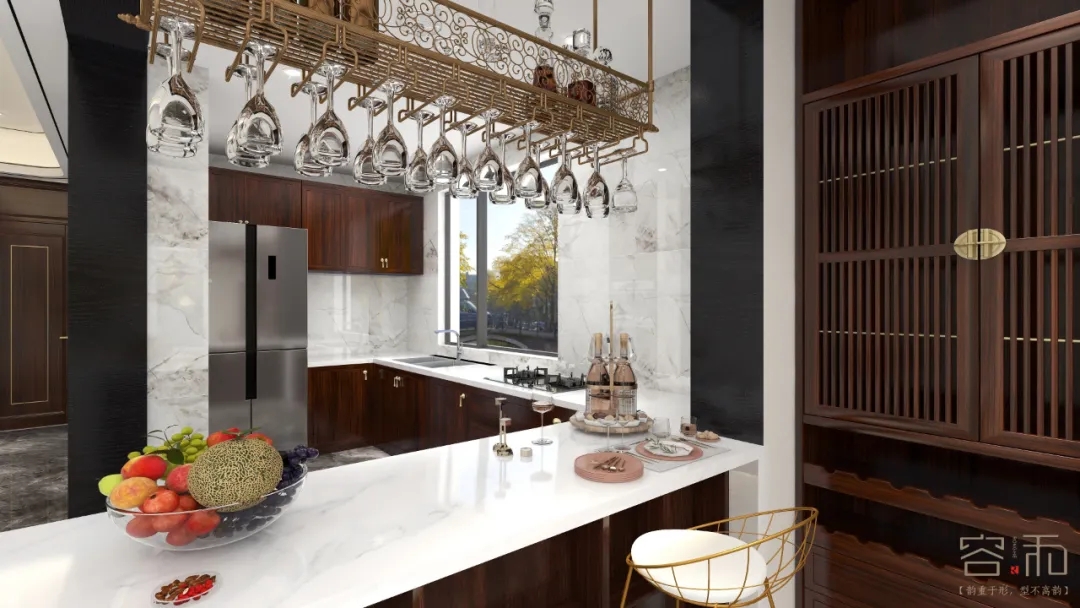 廚房采用開放式廚房設計,和餐廳連接起來,這樣整體空間顯得比較通透。在餐廳和廚房中間設計了休閑吧臺,既可以當做吧臺使用,又可以當做備餐臺,在吧臺上方設計了金屬酒杯架,和吧臺相互輝映,這樣廚房和餐廳兩個空間獨立又統一,隔而不斷。