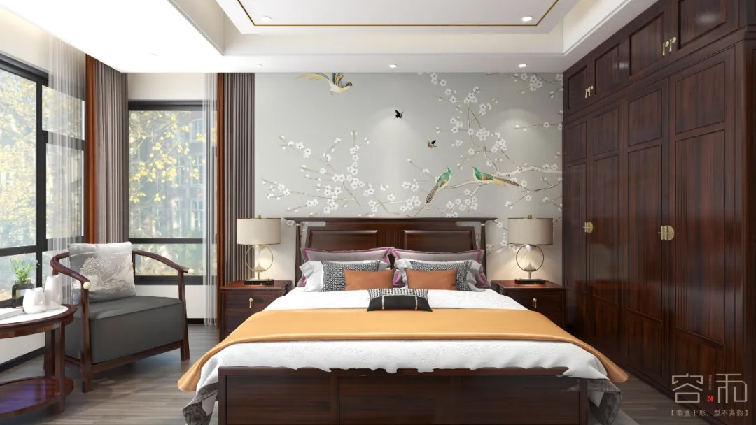 主臥背景墻選中式水墨山水壁布,床屏選用真皮床屏,吊頂是無主燈設計,豐富了空間的層次,凸顯沉穩、低調的氣質。